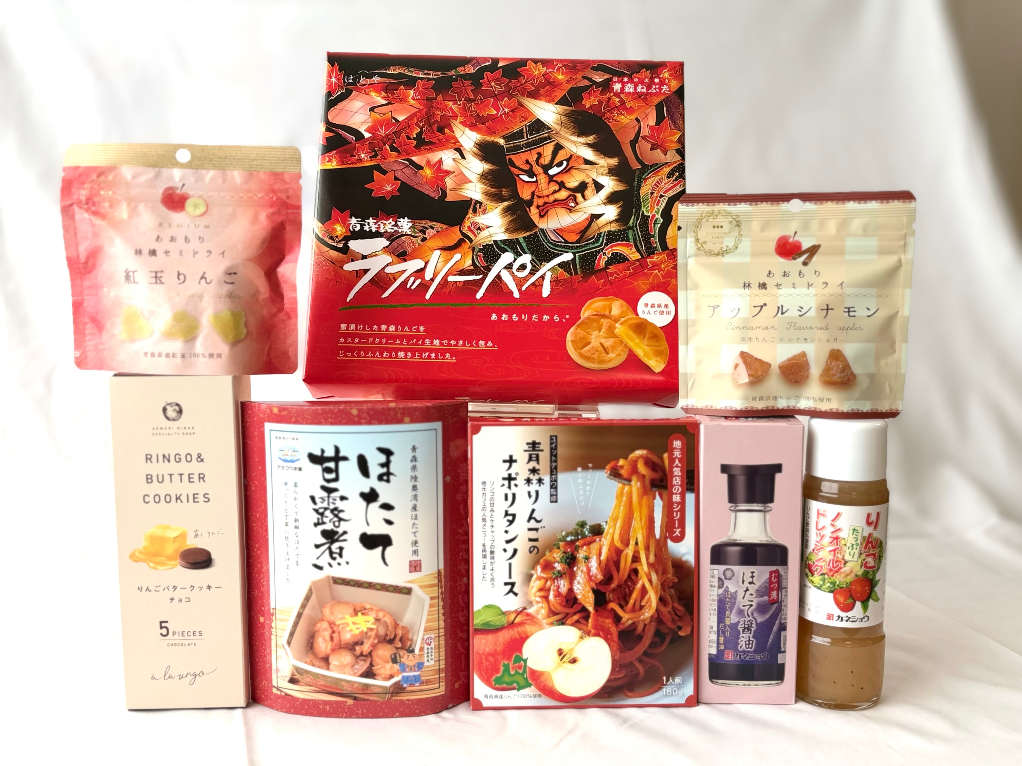 ラブリーパイ(6個入り)、りんごバタークッキー(チョコ・5個入り)、セミドライアップルシナモン、セミドライ紅玉りんご、ナポリタンソース(1人前)、りんごノンオイルドレッシング、ほたて甘露煮、ほたて醤油、